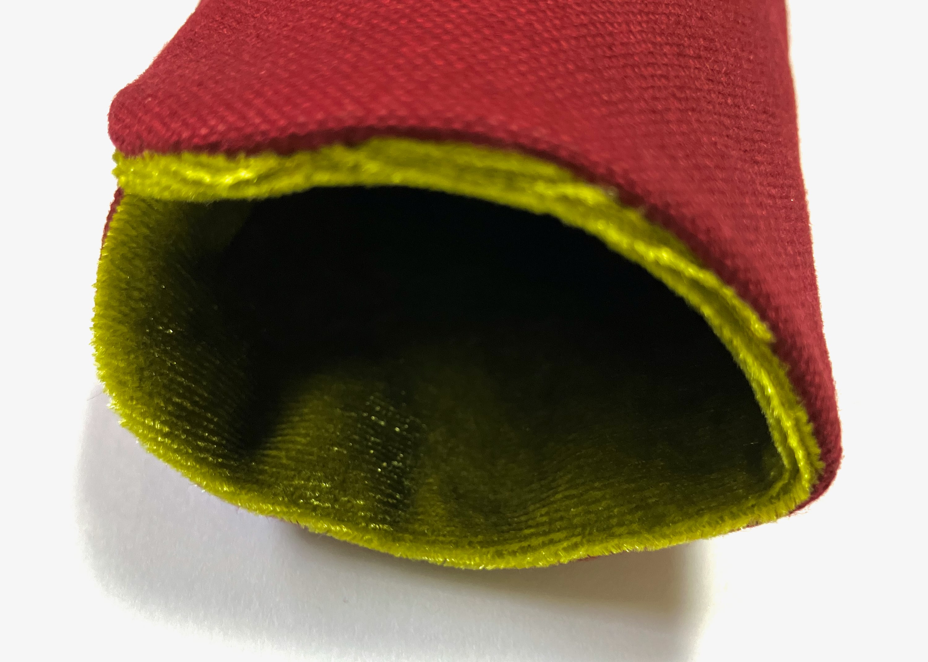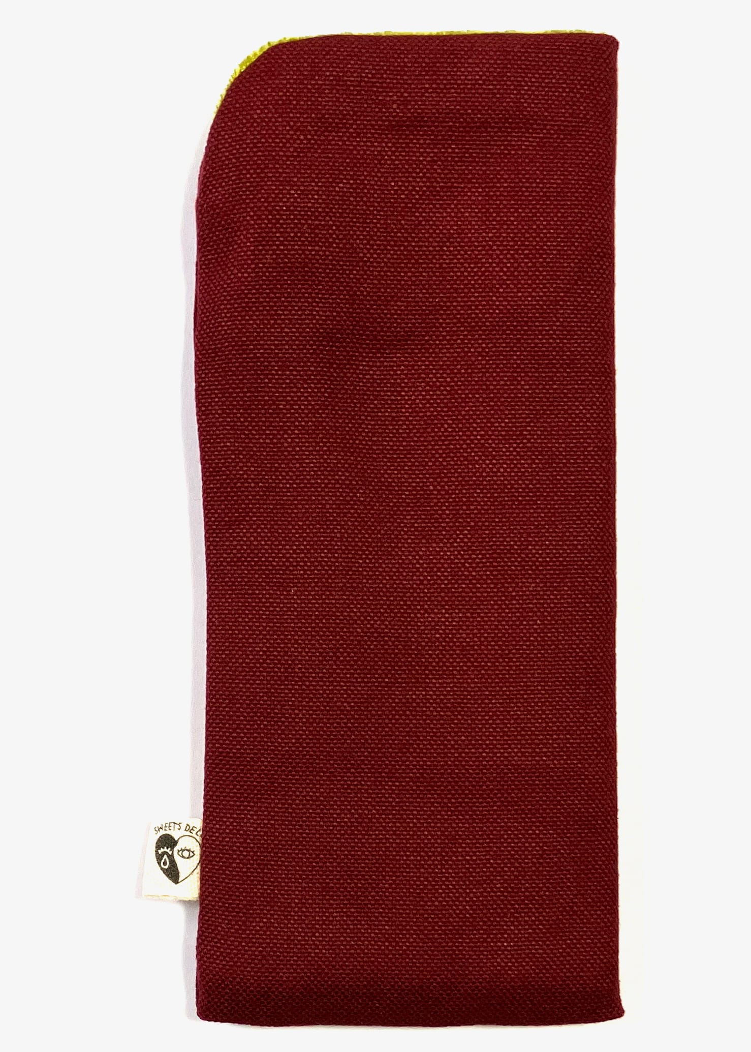 表面は深いワインレッド、内側はモスグリーン。阪急電車好きの柳原念願の色づかいで作成した眼鏡ケースです。
