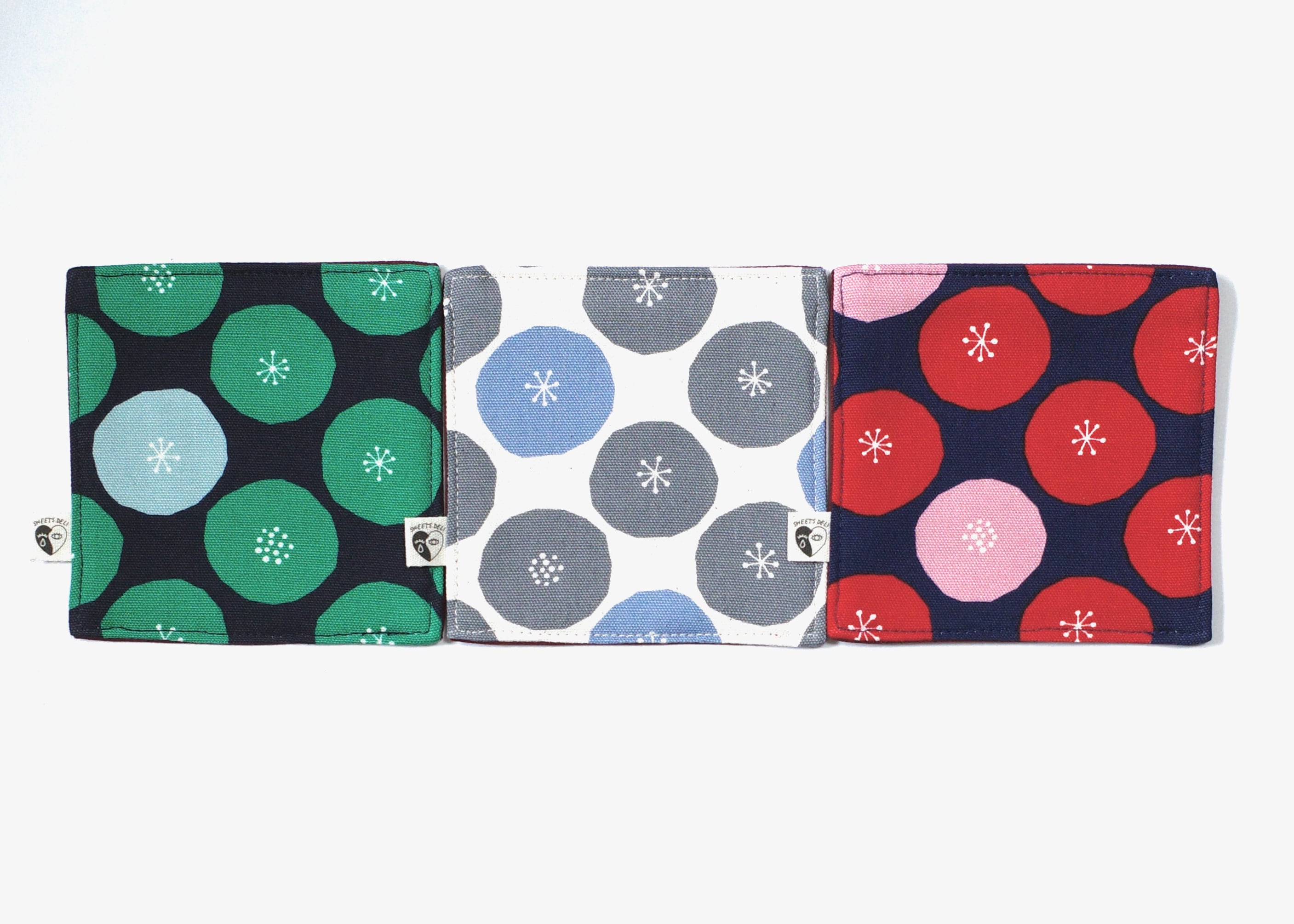 裏面は「生成り+グレー&ブルーの水玉」「ブラック+グリーン&ライトブルーの水玉」「ネイビー+レッド&ピンクの水玉」の3色展開