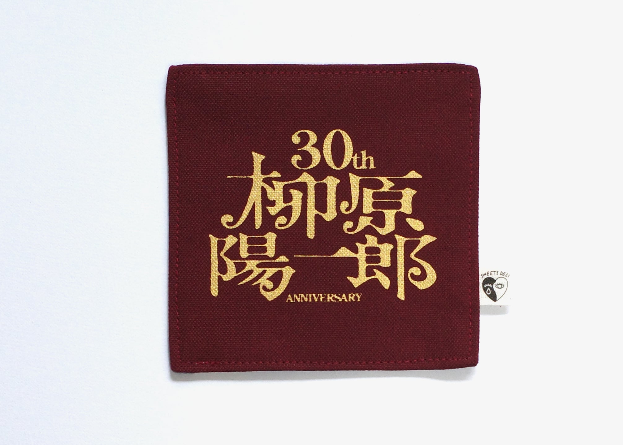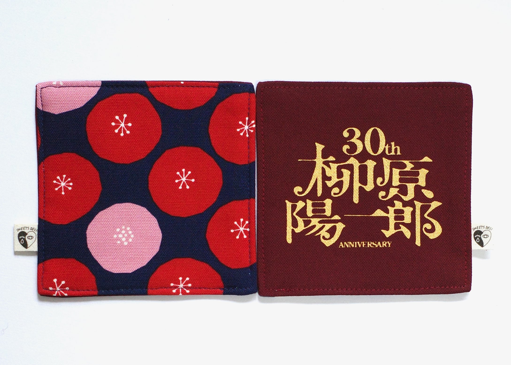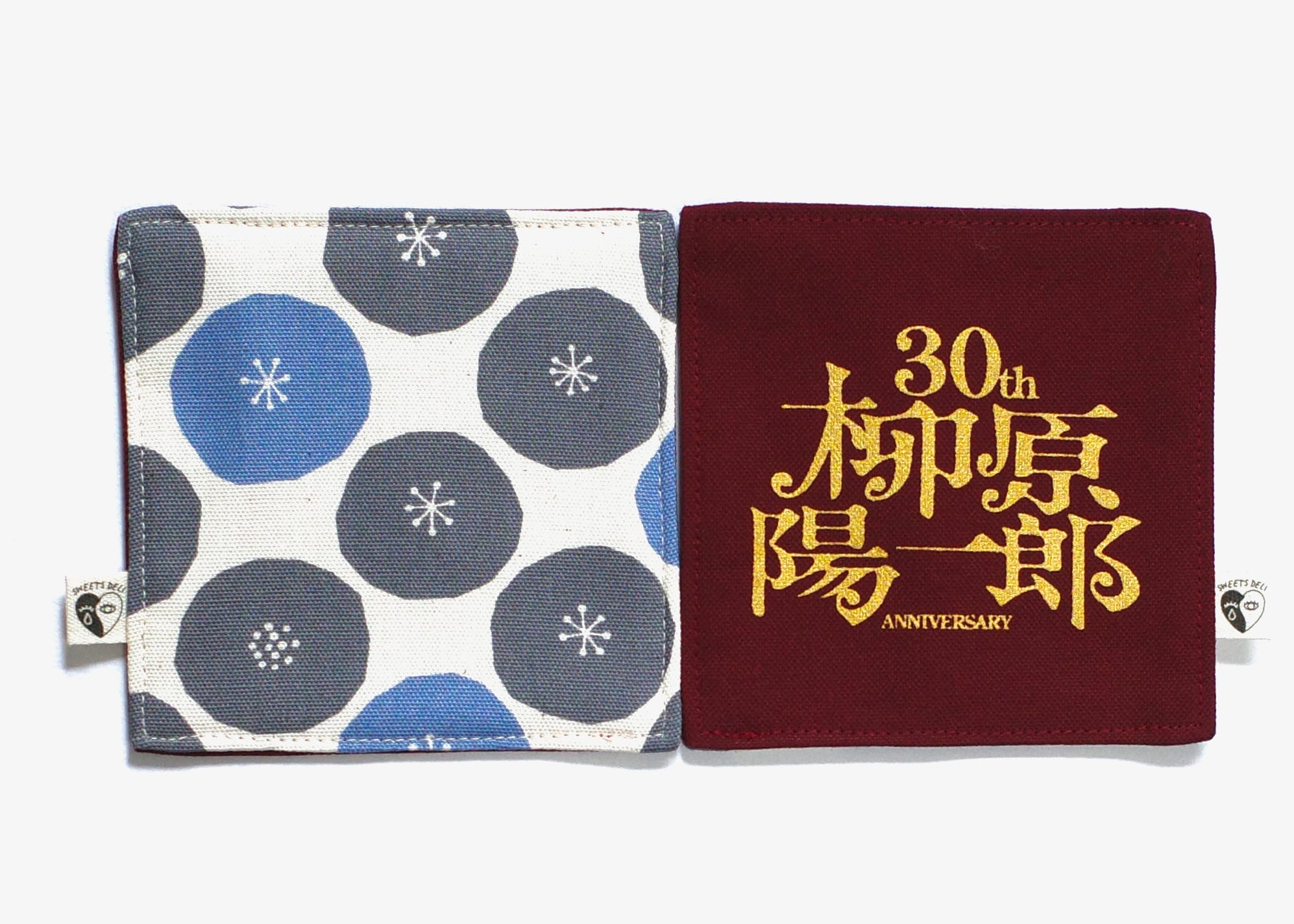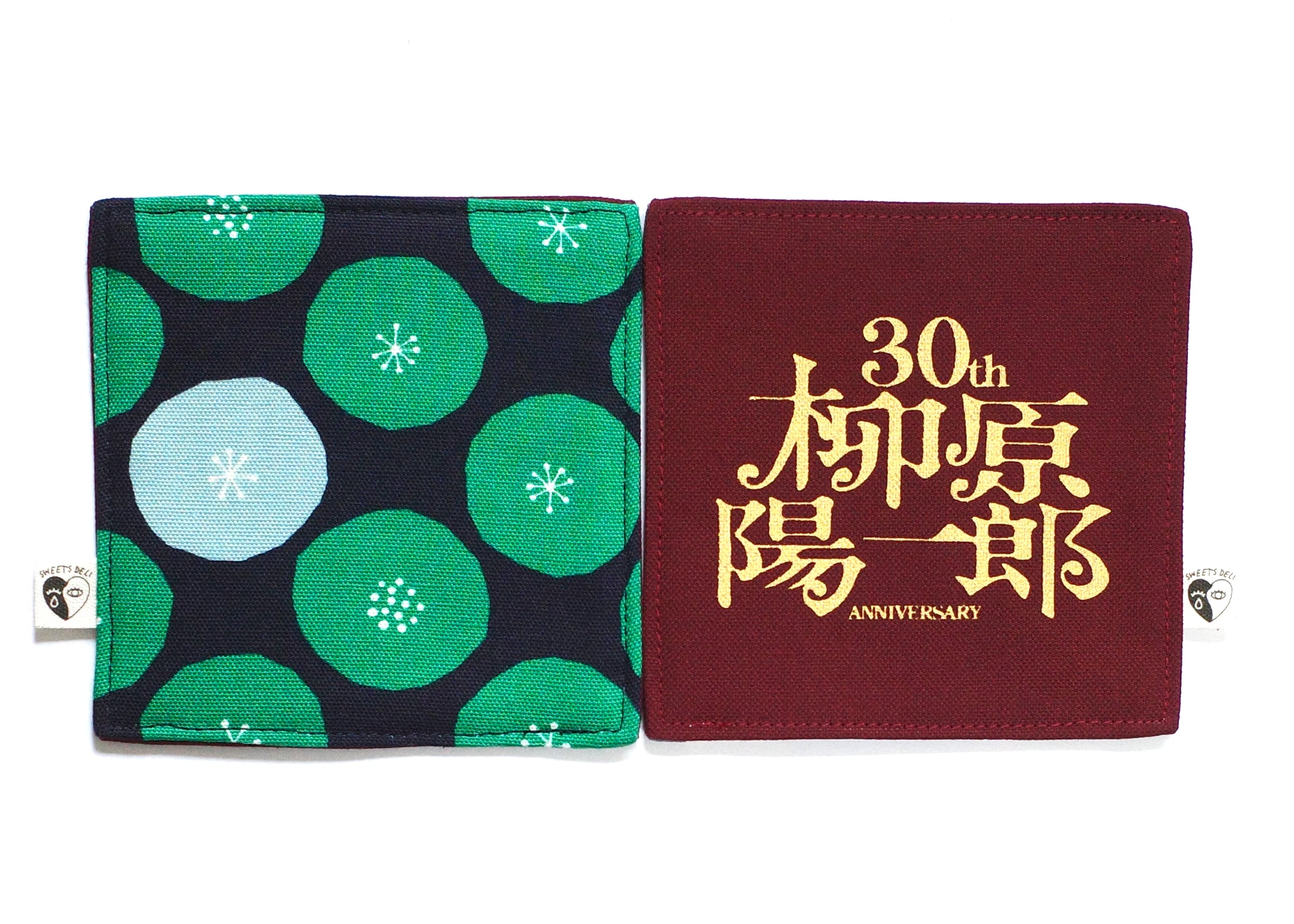 表面は「柳原陽一郎 30th Anniversary」のロゴをゴールドでプリント。裏面はちょっと変わった水玉模様生地。お好みで両面使える綿素材のコースターです。